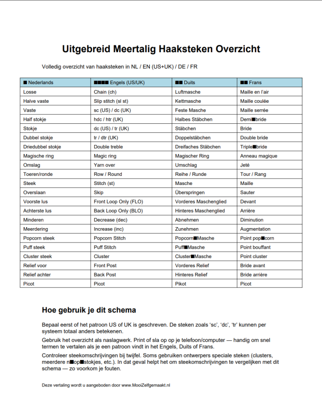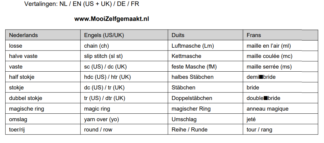 Naast steken is het ook goed om vertalingen van algemene haaktermen te kennen — die komen vaak voor in patronen. Hier zijn enkele veelgebruikte termen uit de lijst van MooiZelfgemaakt: