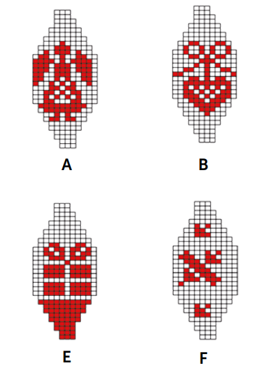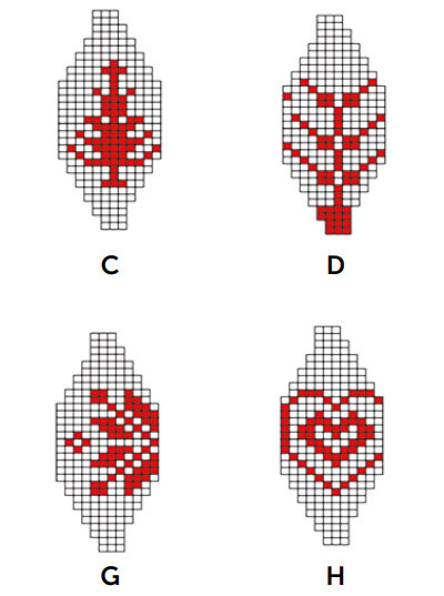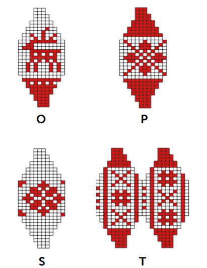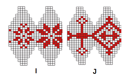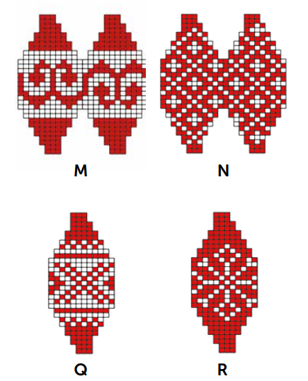 n toeren in jacquardtechniek volgens het betreffende telpatroon rechte steken br. De niet-gebruikte draad aan de binnenkant meenemen en erop letten dat de draad niet te strak aangetrokken wordt. In het telpatroon staat steeds een kwart of de helft van de steken afgebeeld. Onder elk telpatroon staat hoe vaak de steken herhaald moeten worden. In de hoogte zijn alle toeren getekend.