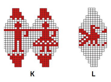 ze worden volgens de kleuren in het telpatroon gebreid. Voor de meerderingen en minderingen de kleur zo kiezen dat de getekende steek ontstaat.